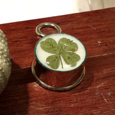 Primer end of a shotgun shell, with a four leaf clover in resin on the back