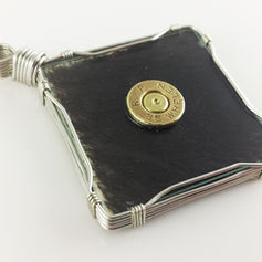 Bear hide, sandwiched between glass, with a base metal wrap. Topped with a bullet primer.